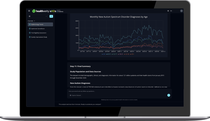 An example of agentic AI like HealthVerity eXOs answering a researcher’s plain-English question about Autism diagnosis by age by pulling information from a database of real-world closed claims data.2