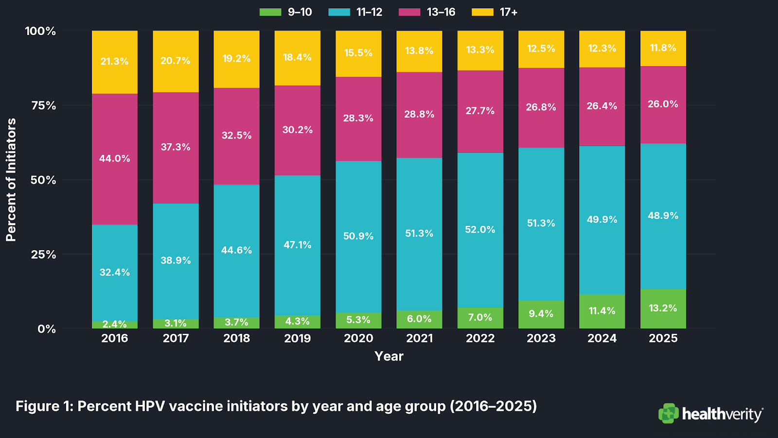 Figure 1: Percentage of HPV vaccine initiators by age group (2016–2025).