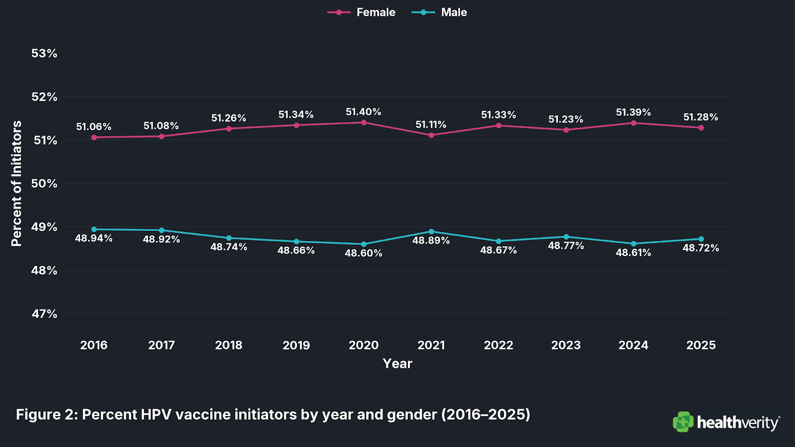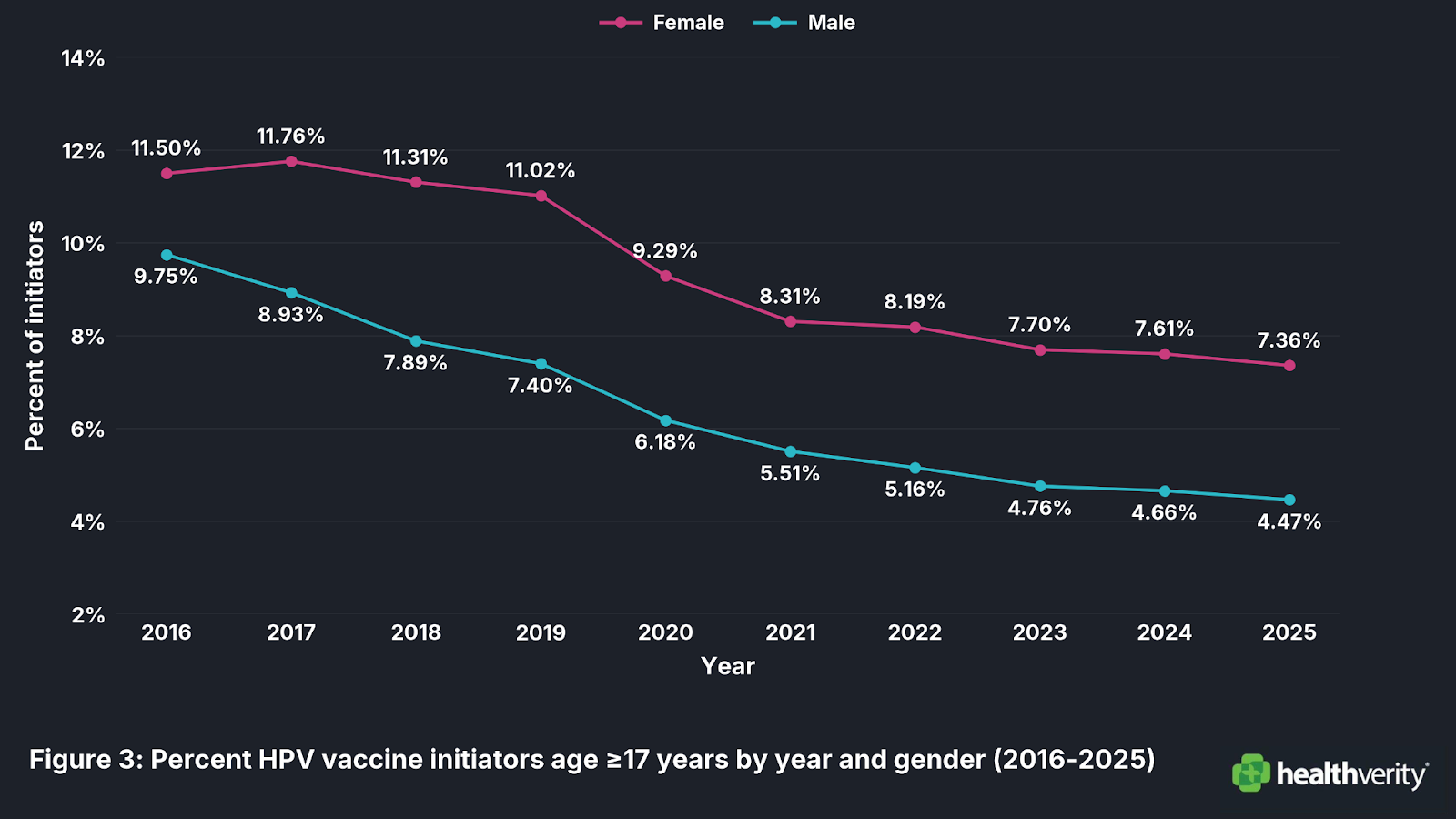 Figure 2: Percentage of HPV Vaccine Initiators by Gender and Year (2016–2025).
