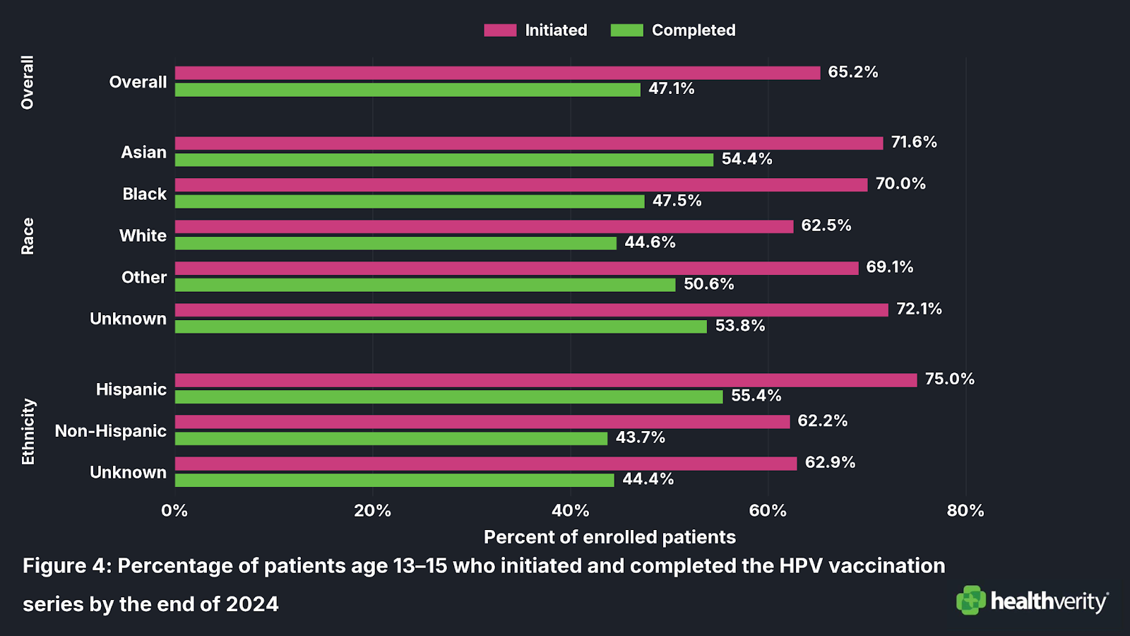 - Non-Hispanic adolescents had lower initiation (62%) and completion (44%) rates