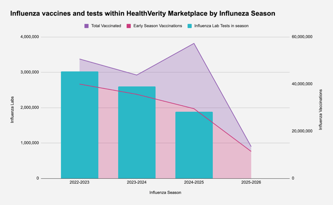 - Early signals indicate continued declines in influenza vaccination uptake and shifts in the timing of when individuals seek testing.